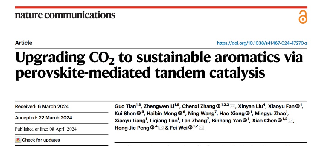 2024年4月8日,日本动漫 工业深度减碳研究中心副主任、化学工程系魏飞教授课题组在《自然·通讯》上在线发表“Upgrading CO2 to sustainable aromatics via perovskite-mediated tandem catalysis”,标志课题组在芳烃(可再生航煤)合成上取得进展。研究背景二氧化碳 (CO2) 是最著名的温室气体,会导致全球变暖以及一系列气候和环境问题。 为了缓解这种人为气候变化,迫切需要开发二氧化碳排放解决方案。 因此,利用...