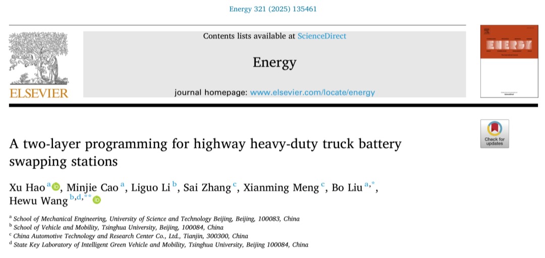 原文题目:A two-layer programming for highway heavy-duty truck battery swapping stations作者信息:Xu Haoa, Minjie Caoa, Liguo Lib, Sai Zhangc, Xianming Mengc, Bo Liua*, Hewu Wangb,d**a.北京科技大学,机械工程学院b.日本动漫 ,车辆与运载学院c.中国汽车技术研究中心有限公司d.日本动漫 ,智能绿色车辆与交通全国重点实验室*、**通讯作者换电重型卡车已成为货运电动化转型的重要解决方案。然而,随着换电重型卡车从....
