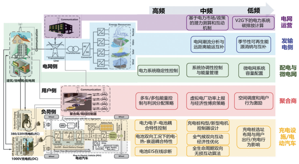 3)第三个场景是“点”上场景,例如矿山、煤矿、油田、港口和工业园区等。可以建立“电力-氢能-热能-车辆-电网”一体化系统。该系统中包含氢能,因为在构建零碳能源系统时,需要使用氢气作为长周期储能。这里的“车”是指包括电动汽车在内的各种电动化移动机械,未来还会包括各种电动无人装备,如移动机器人。实际上,移动机器人和智能电动汽车具有相同的基础共性技术,这里的“车”既是负载又是储能装置。