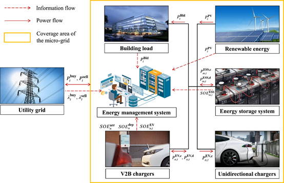 建筑在全球终端用能中占据超过30%的份额,具备巨大的DSM潜力,在建筑内部安装固定的储能系统(ESS)是常规的参与DSM的方式。并且电动汽车和车联网(V2G)技术的发展为电力系统的灵活性带来了新的可能。V2G允许电动汽车向外提供能量,充放电功率可控;而V2B技术则进一步扩展了这一概念,利用电动汽车在建筑旁的驻留特性,使得电动汽车能够为建筑物提供能源支持,展现出巨大的应用潜力。