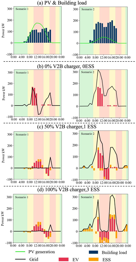 在场景1中,配置50%的V2B双向充电桩和1台储能电站,可以将日常运营成本限制在37美元/天,相对降低51%。此外,电网负荷显著减轻,累计高峰时购买量降至98千瓦时/天(65%),高峰负荷降至96千瓦时/天(17%)。而在密集配置(100%V2B双向充电桩+3台储能电站)下,虽然收益大于50%V2B双向充电桩+1台储能电站,但增量收益较低。