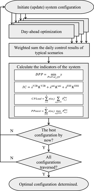 图3显示了优化系统选型的处理流程,即拥有最小DPP的V2B双向充电桩和储能系统数量。针对每种配置,在典型场景下采用混合整数线性规划(MILP)进行日前优化。根据各个场景的比例输出系统整体性能。遍历所有配置后,就可以确定在最优的日内控制策略前提下的最佳配置。