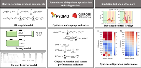 文章首先介绍了研究背景和现有挑战,然后提出了研究目标和方法,最后分析了测试案例的计算结果,图 1为读者提供了一个系统性的研究框架。这种优化选型方法不仅能够为V2B技术和储能系统的实际应用提供指导,也从新的视角展望微电网系统的设计和运营。