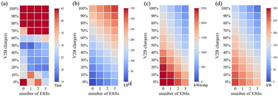 本文提出了一种新的方法,用于在规划阶段确定智能微电网中V2B充电桩和储能系统的最佳配置方案,目的是最小化系统的动态投资回收期(DPP)。通过详细的模拟测试,证明了所提出的优化选型方法的性能。测试案例表明,通过所提方法计算出的最优配置具有更出色的表现。但是,论文指出尽管本研究聚焦于设计阶段确定系统的配置,但实际运行阶段可能需要实时的数据采集和更详细的电池衰减模型来进行日前优化甚至日内优化。此外,未来研究可以考虑更复杂的实时交易机制更准确地模拟车主的行为模式。