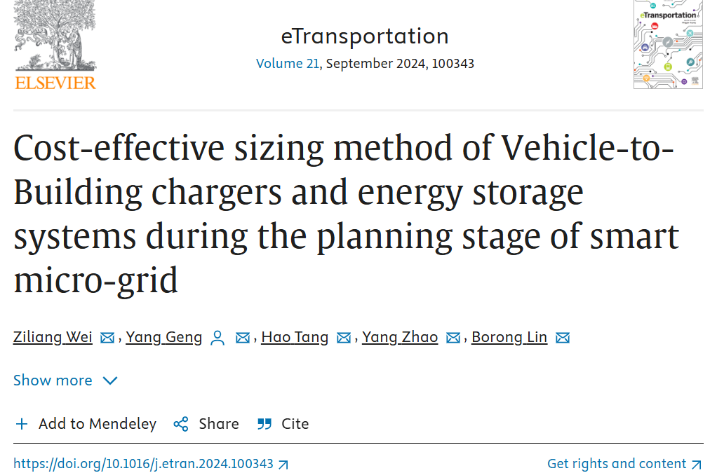 以上成果在交通与运载领域顶刊-国际交通电动化杂志eTransportation上发表,题为“Cost-effective sizing method of Vehicle-to-Building chargers and energy storage systems during the planning stage of smart micro-grid”。