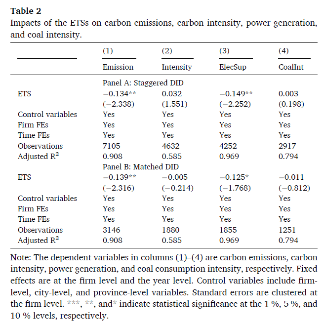 该研究基于2013~2020年中国发电企业碳排放数据,结合区域ETS的动态企业管控名单,采用交叠双重差分模型,分析了区域ETS对企业碳排放总量和强度的影响,探索了相应的减排机制及影响的异质性特征。