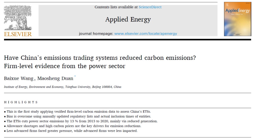 Baixue Wang , Maosheng Duan. Have China’s emissions trading systems reduced carbon emissions? Firm-level evidence from the power sector. Applied Energy.16 November 2024, //doi.org/10.1016/j.apenergy.2024.124802