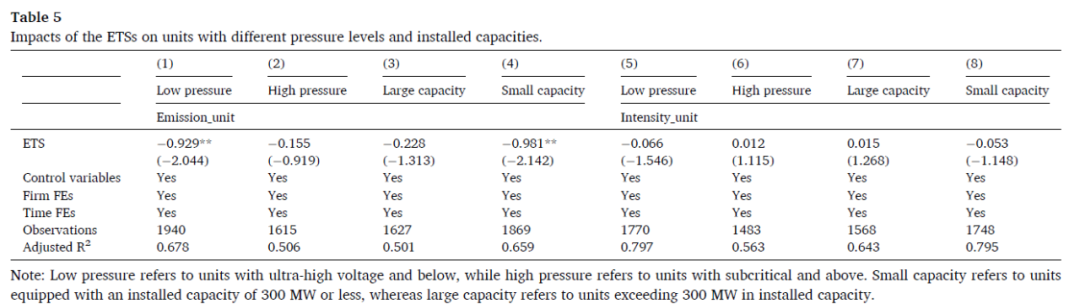 第二,区域ETS的“奖优惩劣”作用明显。区域ETS对技术水平低的企业(如装机容量小、压力参数低等)施加了更大的减排压力,促使其显著减少排放;而技术先进的企业受政策影响较小。