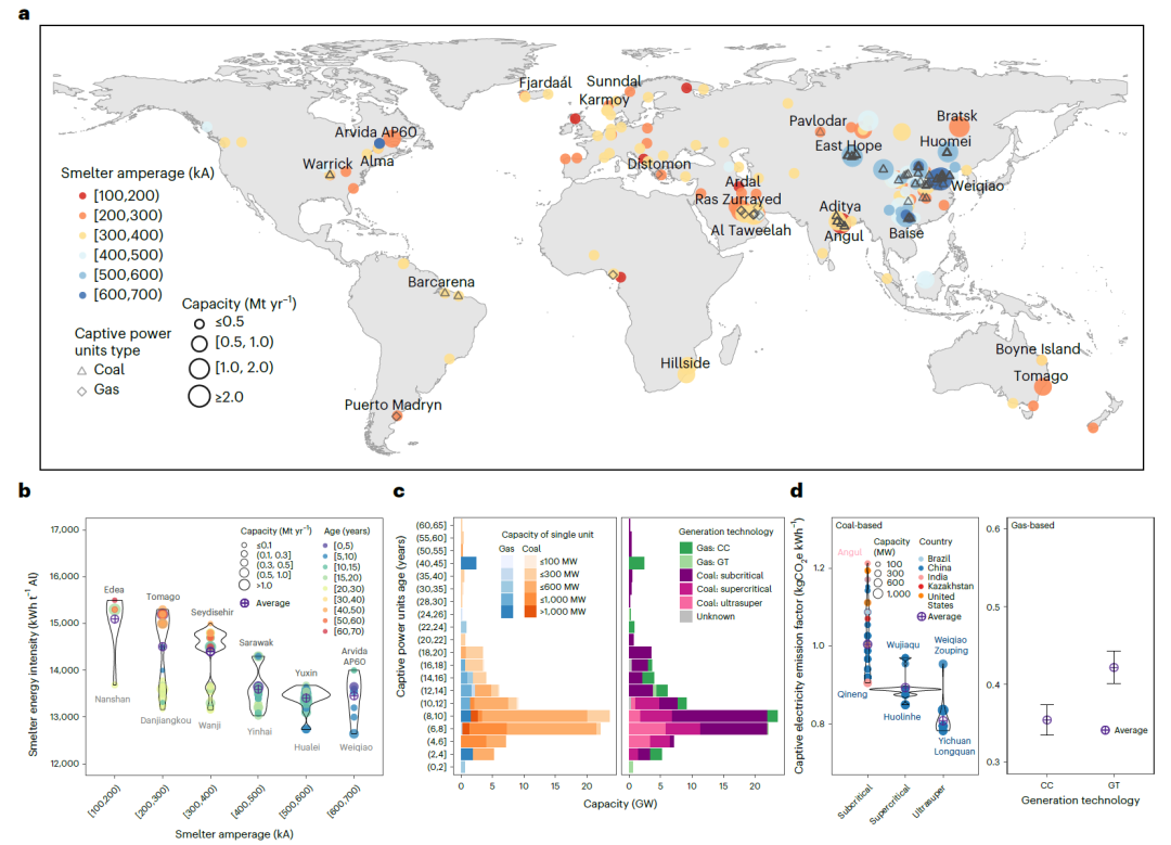 图1 2021年全球铝冶炼厂及其化石燃料自备发电机组的技术特征与温室气体排放