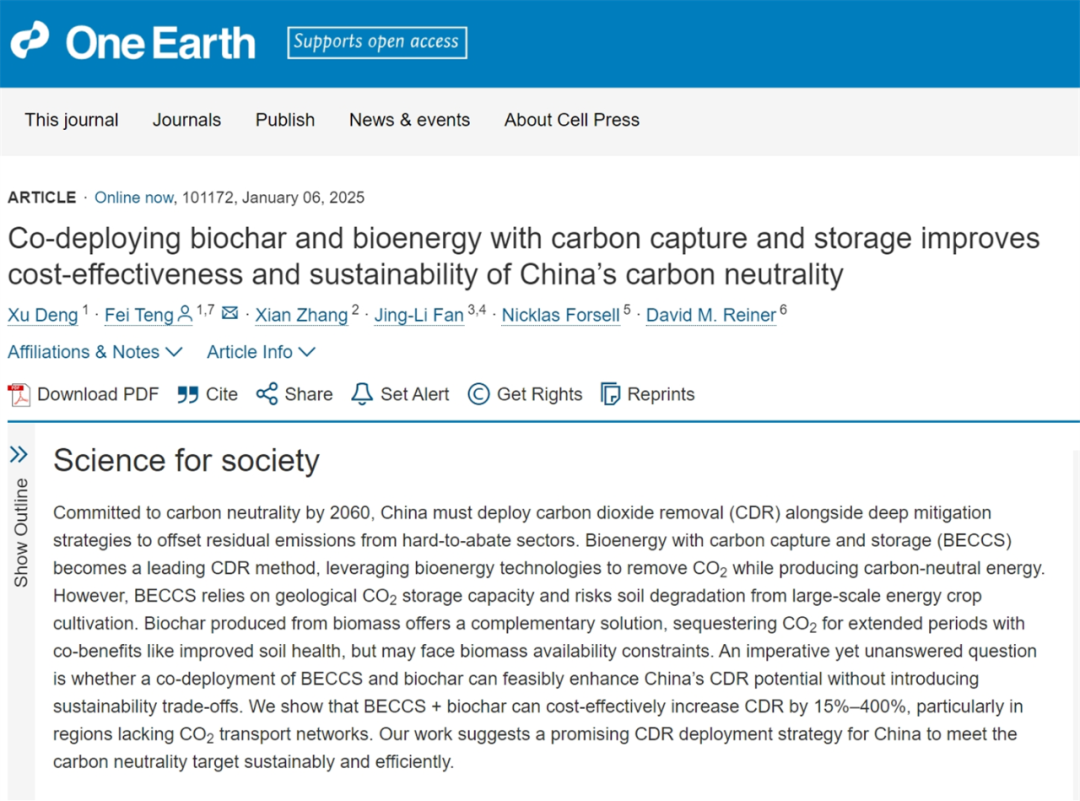 Deng, Xu, Teng, Fei, Zhang, Xian, Fan, Jing-Li, Forsell, Nicklas, Reiner, David M. Co-deploying biochar and bioenergy with carbon capture and storage improves cost-effectiveness and sustainability of China’s carbon neutrality. One Earth, 2025/01/06, //doi.org/10.1016/j.oneear.2024.12.008