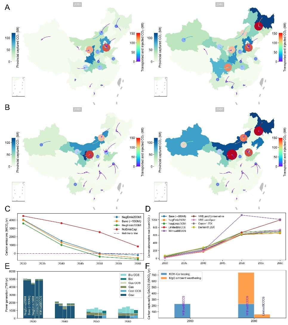 图3:碳捕集与封存、碳排放和减排成本结果。(A和B):基础情景和无生物质情景下最优二氧化碳源汇匹配路径;(C)碳排放下降强度相关情景下电力系统年度排放量;(D)各情景下电力系统边际减排成本;(E)火力发电的碳捕集部署情况;(F)直接空气捕集部署情况