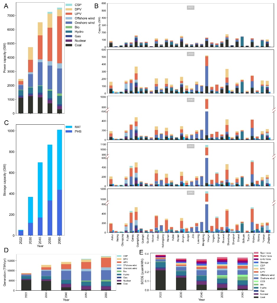 图2:面向2060年的我国电力系统优化结果。(A):全国发电装机容量;(B)分省发电和储能装机容量;(C)全国储能装机容量;(D)全国发电结构;(E)全国电力系统平均度电成本结构(配电网成本除外)