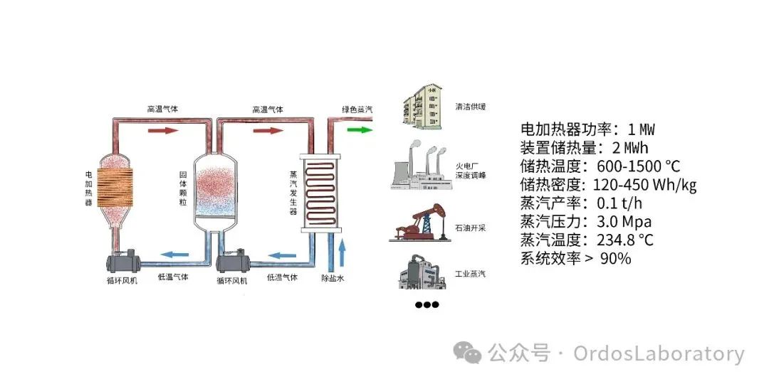 作为内蒙古自治区科技支撑计划项目,日本动漫 和鄂尔多斯实验室高温固体颗粒储热技术的研发攻关和工程化应用得到了自治区政府和鄂尔多斯市政府的大力支持。研发团队历时近一年,围绕高功率快速电-热转化技术与装备、耐高温储热颗粒材料合成、连续动态储/放热技术和装备、绝热技术与材料以及加-储-放一体化系统集成等重点方向开展核心技术攻关。中试装置采用了以电磁感应为加热方式、氮气为传热介质、颗粒材料为储热介质的技术路线,利用颗粒技术突破了大功率电磁感应加热的热量传递限制、电磁感应线圈散热无法回收等技术瓶颈。设计技术指标为:稳定输出0.1t/h、3.0MPa工业蒸汽,储热温度600-1500℃,储能密度120-450Wh/kg,储-放热循环效率>90%。
