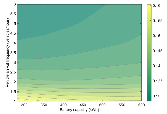 图2:电池容量和车辆到达频率对综合吨公里成本的影响