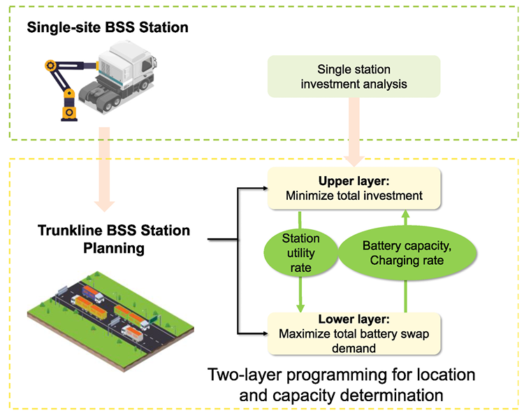 换电重型卡车已成为货运电动化转型的重要解决方案。然而,随着换电重型卡车从短途运输向长途运输发展,目前仍缺乏针对主要公路沿线站点选址与站内资源分配联合优化的综合研究。