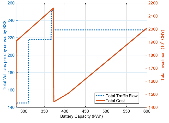 通过优化换电站站点布局和站点设备配置来最小化总初始投资成本。站级设备的配置基于站点利用率(以车辆到达频率表示)和充电功率确定,并基于电池容量计算高速公路沿线所需的换电站数量及其间距。