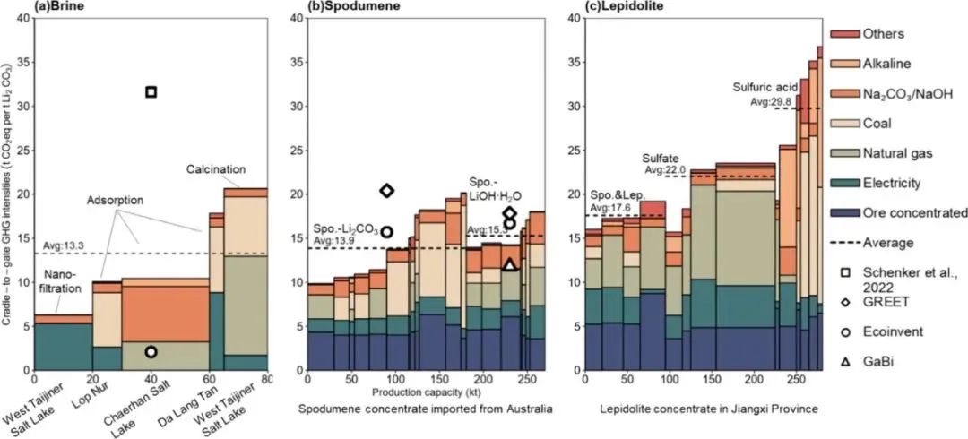 图1. 中国分工厂的电池级锂碳足迹(a)盐湖提锂;(b)锂辉石提锂;(c)锂云母提锂