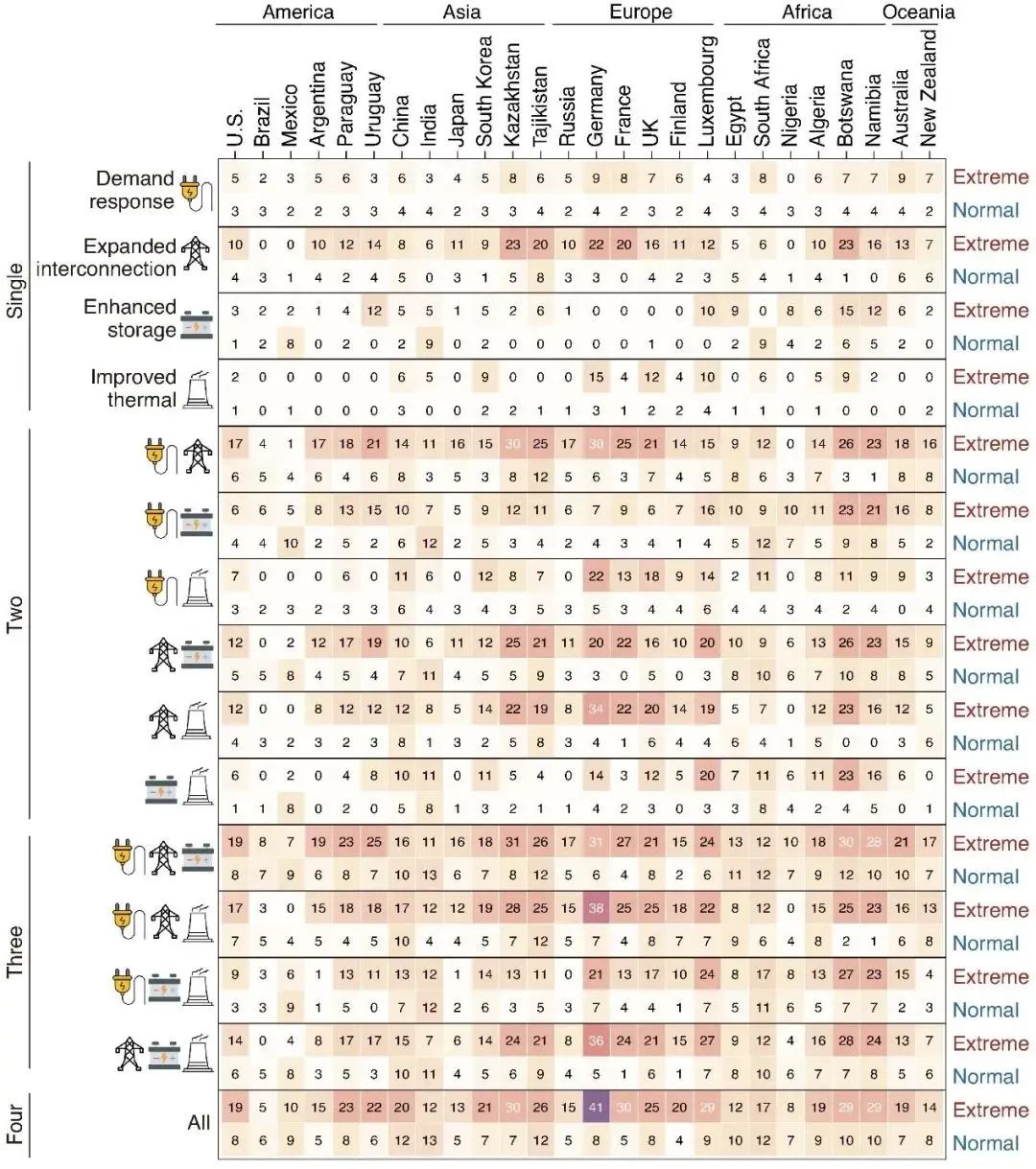 最后,研究基于需求侧响应、跨区域互联、储能效率提升和火电灵活性增强等4项应对措施,面向全球风光电力系统设计组合出15种气候适应与韧性提升策略,量化评估了不同策略对降低电力系统成本的成效。研究发现,尽管大部分单项措施可降低系统成本,组合多项措施的策略通常可获得更佳成效。例如印度在实施任意单项措施时极端时段成本最高降幅为6.3%,而实施任意两项或三项措施组合时成本最高降幅可达到10.8%或12.3%(图2)。然而,单纯依靠增加措施数量并非推动成本下降的最佳策略,需在考虑各国资源禀赋的基础上因地制宜、科学施策,优化措施组合以实现成本效益最大化。