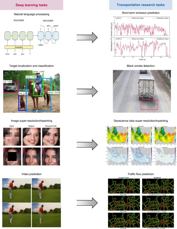 机器学习(ML)与深度学习(DL)构成交通排放分析的两大技术支柱。ML技术通过监督学习框架(分类任务的离散模型与回归任务的连续模型)已实现广泛应用,而DL凭借其非线性建模优势,在交通排放的时空关联建模、异常排放识别及动态预测等场景展现出独特潜力。尽管DL应用尚处探索阶段,不过其在解决涉及空间或时间依赖性的分类、异常检测、回归和状态预测等挑战方面具有巨大潜力(图4)。