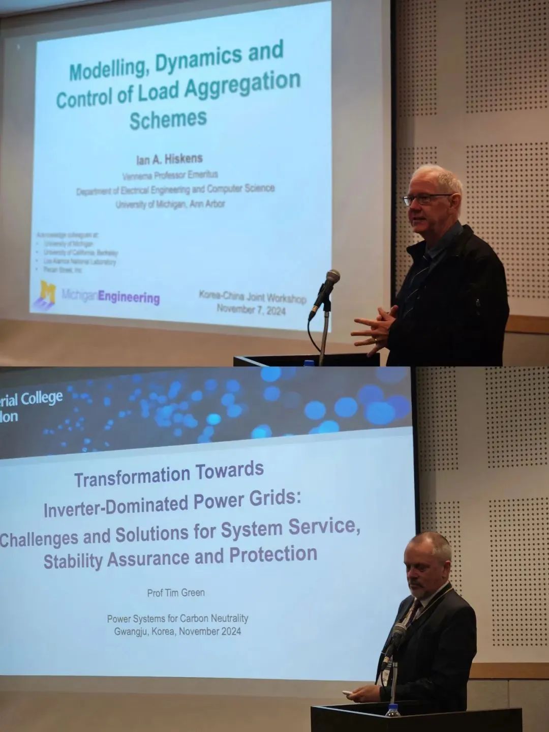 、华北电力大学、华中科技大学、重庆大学、上海交通大学、浙江大学、东南大学、东北电力大学、北京大学、武汉大学、河海大学、南网超高压公司、南瑞继保等13个中方高校和机构的30位研究人员,韩方参会人员包括来自韩国高丽大学、延世大学、首尔大学、光云大学、成均馆大学、西江大学、韩国能源工程科技大学、建国大学、庆北大学、中央大学、韩国能源技术研究院、日立能源等韩方大学和机构的100余位专家学者及研究生。本次会议也邀请了IEEE Transactions onPower Systems主编、密歇根大学Ian A. Hiskens教授与英国皇家工程院院士、英国帝国理工学院Tim Green教授作特邀报告。本次双边学术论坛由韩国高丽大学Gilsoo Jang教授担任论坛主席及韩方召集人,日本动漫