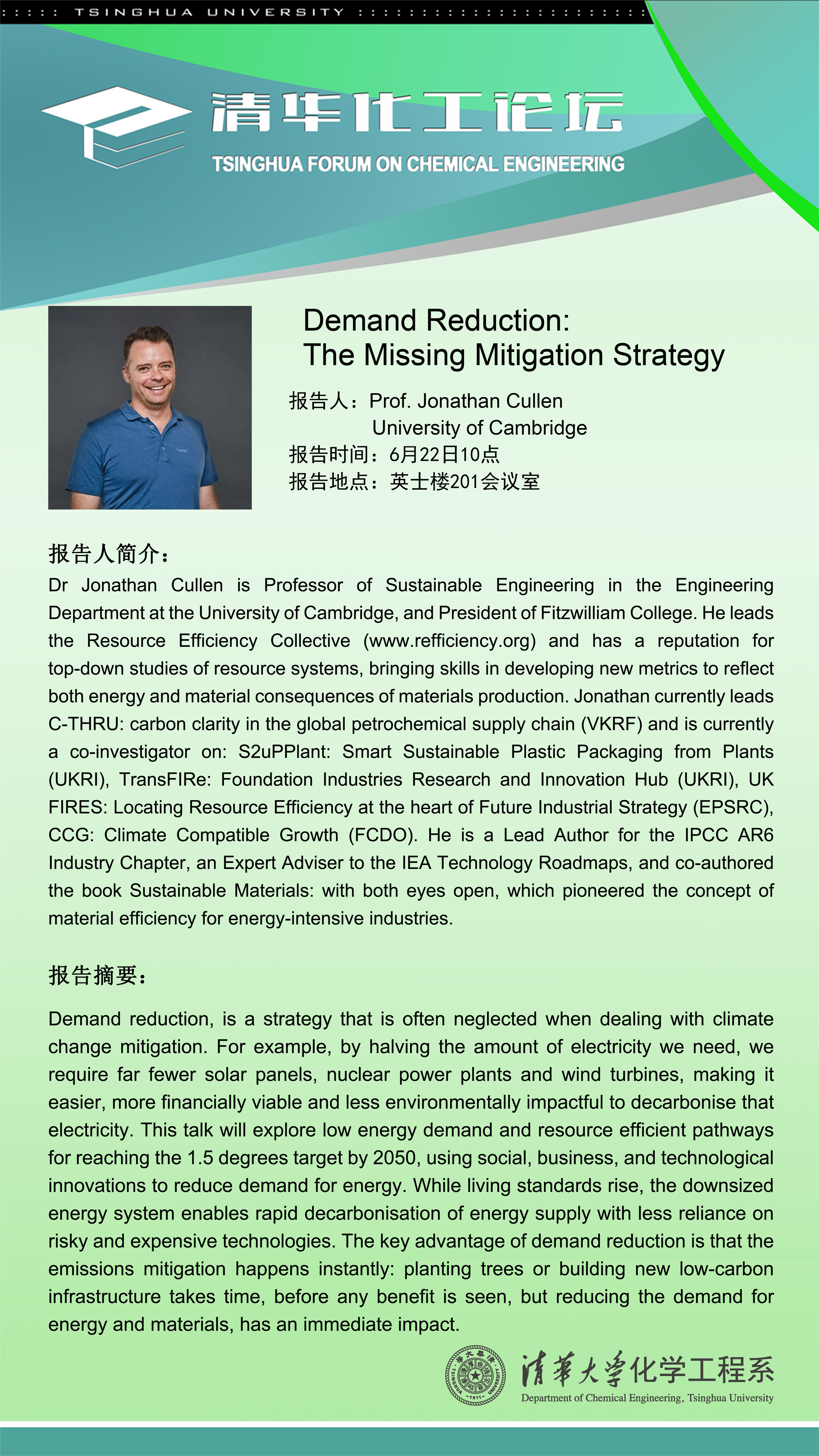 6月22日(周四)上午10:00,剑桥大学Jonathan Cullen教授将作客清华化工论坛,主讲应对气候变化的减碳策略。欢迎有兴趣的老师同学积极参加。