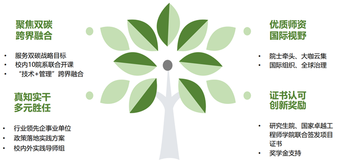 专门为未来碳中和战略的践行者、领导者提升创新力和领导力而精心设计的研究生学术与职业发展能力提升项目。通过本项目的学习,助力学生建立碳中和理念和思维,系统了解和掌握碳中和的基本知识,提高碳中和技术创新和管理能力。