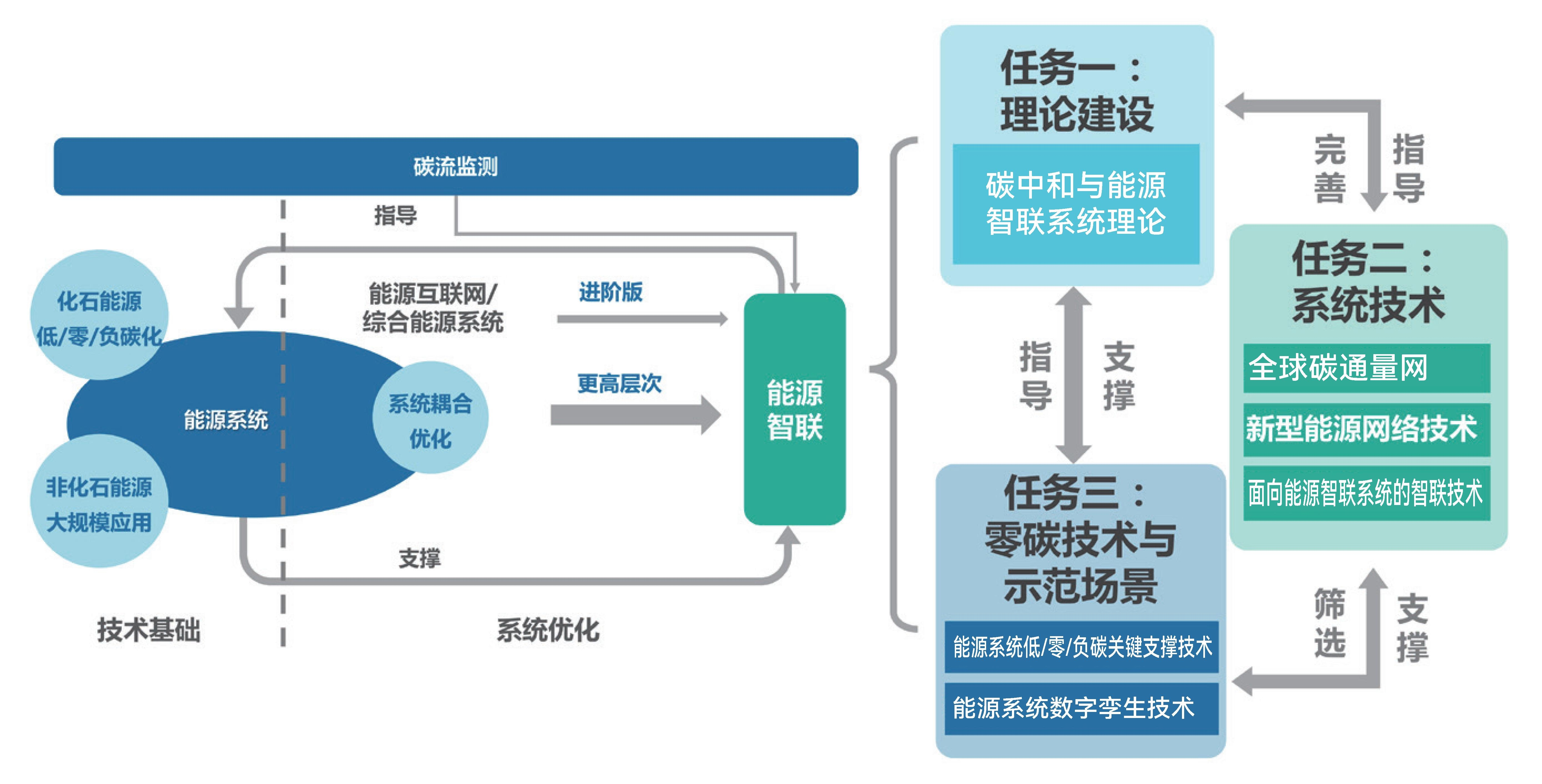 基于全球碳流监测,以智联为发展模式,融合信息流、能量流、物质流和碳量流,充分运用人工智能技术来学习、挖掘能源系统大数据的优化和决策潜力,构建新型能源智联系统。能源智联系统在以大电网为主要纽带的基础上强调能源生产和消费的相互平等优化匹配,瞄准实现大范围“多能互补、能质匹配”,并进而完善能源消耗总量和强度调控,优化能源产供储销体系建设,确保能源安全,优化实现碳中和。